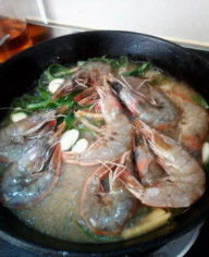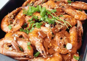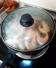 Step 2:热锅下油,油八成热下花椒粒,葱姜蒜爆香,下腌制好的虾,两面炒变红