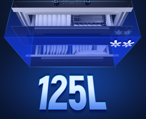 125L全腔一体式消储,同时可容纳98件餐具,无味无残留,有效杀灭顽固病菌,全方位守护家人健康