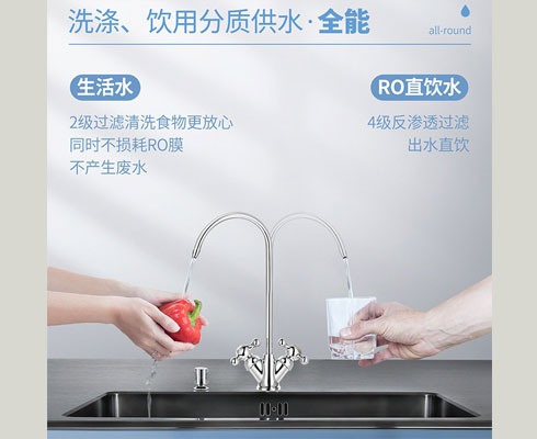 2级过滤清洗食材更放心,同时不损耗RO膜,不产生费水,4级反渗透过滤系统,出水直饮,省心。