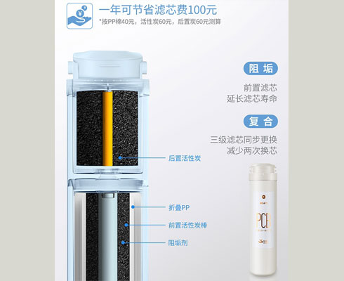 三级合一滤芯(折叠PP棉+前置活性炭+阻垢剂+后置活性炭),一年换一次芯,省钱。