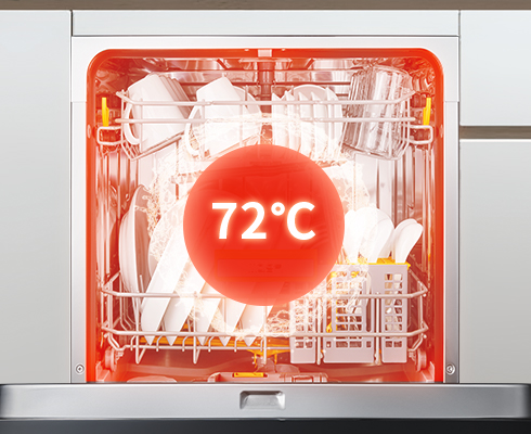 72摄氏度高温热水煮洗,强效洗净餐具,有效杀灭手足口病毒、脊髓灰质炎病毒等,除菌率达99.99%,坚定守护家人健康。