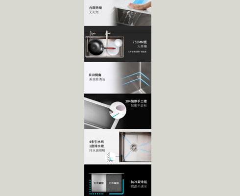 ①专利一体台面设计,台面无缝隙,一擦全干净,台面无断面,厨房美观时尚;②一体槽设计:大单槽,锅碗瓢盆大件轻松洗,内嵌台下盆,无缝易清洁;③韩国张浦304不锈钢加厚质量好,更耐用;④R10倒角,精致、美观、易清洁。