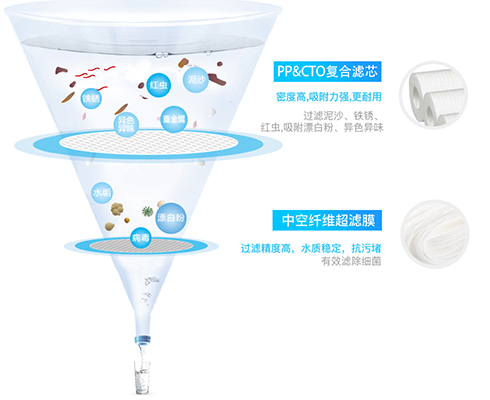 复合滤芯,密度高,吸附力强,更耐用,中空纤维超滤膜,过滤精度高,水质稳定,抗污堵,有效滤除细菌。